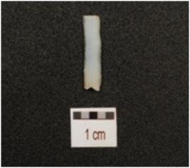 | Description / विवरण | Fragment of parallel sided chalcedony blade with single ridge on dorsal, triangular in section, use wear marks on cutting edge and broken along both ends. |
