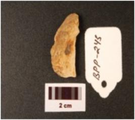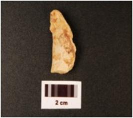 | Description / विवरण | Chert flake, irregular shape, blunted on the leteral sides, weathered condition. |