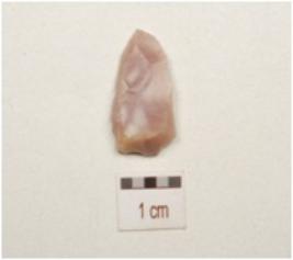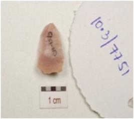 | Description / विवरण | A chert blade with single ridge and flake scars on dorsal, striking platform and slightly chipped off diffused bulb on ventral, triangular in section and use wear marks on cutting edge. |