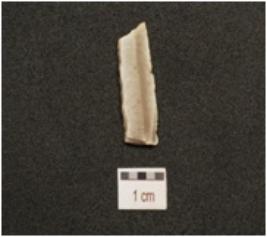 | Description / विवरण | A backed balde made on chert, end struck flake, blunted one side, sharp cutting edge, use wear marks on cutting edge, one prominent ridge on dorsal surface and trapezoidal in section. |