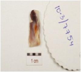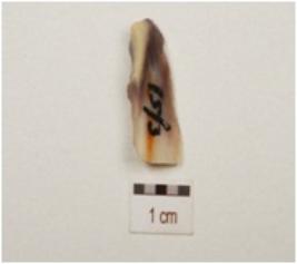 | Description / विवरण | A chert blade with mid ridge on dorsal, striking platform, diffused bulb on ventral, triangular in section and use wear marks on cutting edge. |
