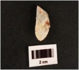 | Description / विवरण | A chert flake with three flake scars on dorsal surface, sharp edges, positive bulb on ventral side, smooth surface and striking platform. |