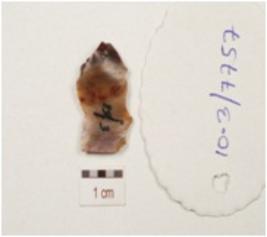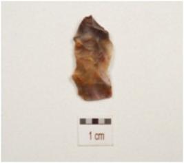 | Description / विवरण | A chert blade with single ridge and flake scars on dorsal, triangular in section, prepared platform, slightly chipped off prominent bulb on ventral, use wear marks on cutting edge and broken along distal end. |