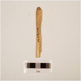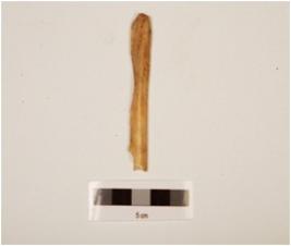 | Description / विवरण | Fragment of bone point, slightly uneven in shape, flat from inside, ridge on other side, broken from bottom and polished surface. |