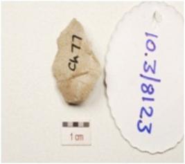 | Description / विवरण | A utilized flake made on chert, end struck flake, ,prominent bulb on ventral surface, use wear marks on cutting edge, flake scars on both surface and triangular in section. |