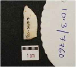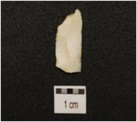 | Description / विवरण | A chert blade with prominent mid ridge on dorsal, triangular in section, irregular retouches on cutting edge and broken along proximal end. |