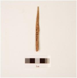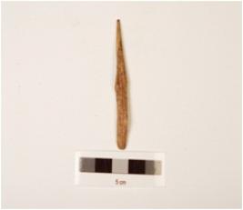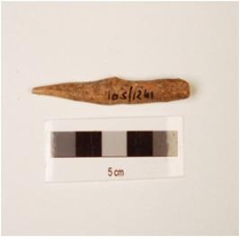 | Description / विवरण | Fragment of bone point, pointed top, broken from bottom, uneven surface, slightly round in shape, groove inside and rough surface. |