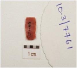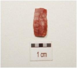| Description / विवरण | Fragment of parallel sided chert blade with single ridge on dorsal, trapezoid in section, use wear marks on cutting edge and broken along both ends. |