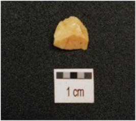 | Description / विवरण | A chert blade with single ridge on dorsal, prepared platform, bulb on ventral, triangular in section, use wear marks on cutting edge and broken along distal end. |