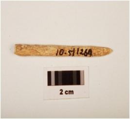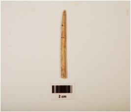 | Description / विवरण | Fragment of bone point, pointed top, broken from bottom, round in shape, rough surface and off white in colour. |