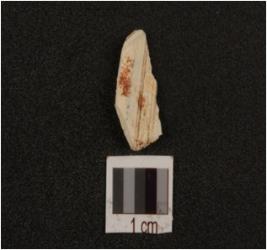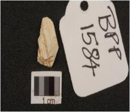 | Description / विवरण | Single side blade on chert with flake scars on dorsal side and negative bulb on ventral side, cortex visible on surface. |