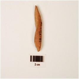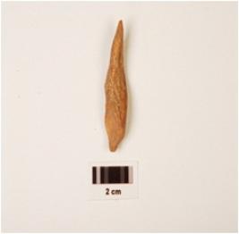 | Description / विवरण | Fragment of bone point, slightly thick in character, uneven in shape and surface, pointed both ends, polished surface and brown in colour. |
