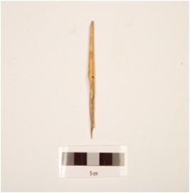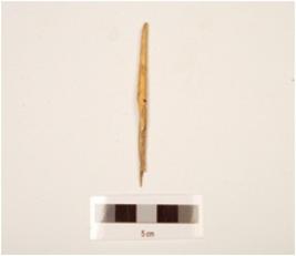 | Description / विवरण | Fragment of bone point, pointed both ends, thin in character, broken from surface and bottom, yellow in colour and polished. |