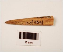 | Description / विवरण | Bone point with a pointed end and broken at other end, hollow part of bone marrow visible on one side, cut marks on surface, polished surface, slightly blunt point. |
