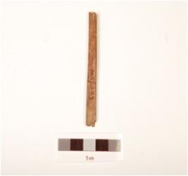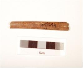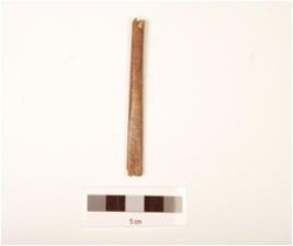 | Description / विवरण | Fragment of bone point, broken both ends, slightly flat surface, uneven sections, polished and brown in colour. |