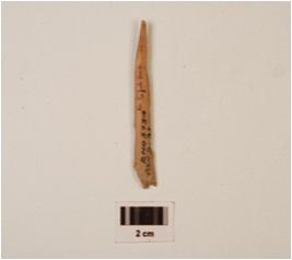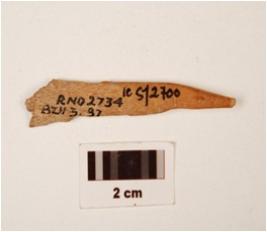 | Description / विवरण | Bone point chipped all over body, poined at one end, broad at other end, bone marrow hollow visible on one side. |