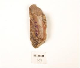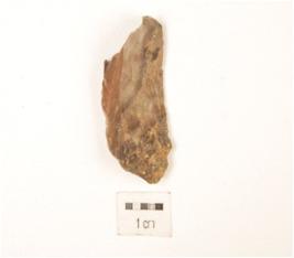 | Description / विवरण | A utilized flake made by chert and flake scars on the surface, use wear marks on the cutting edge, cortex on surface. |