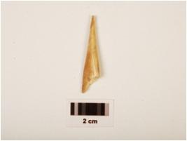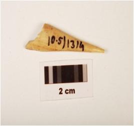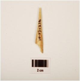 | Description / विवरण | Fragment of bone point, broken from bottom, pointed top, polished surface and off white in colour. |