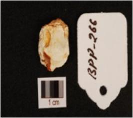 | Description / विवरण | Flake made by chert, irregular shape, bulb of percussion on the ventral side, use wear mark on the cutting edges. |