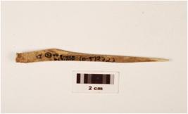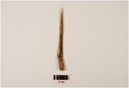 | Description / विवरण | Bone point with a pointed end the other end broader and broken slightly, slender body, rectangular cross section, round cross section on pointed end, hollow part of bone marrow visible on one side. |