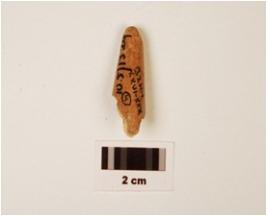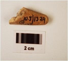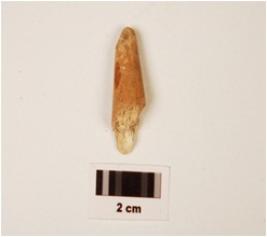 | Description / विवरण | Fragment of bone point, round top, broken from bottom, slightly thick in character, polished and off white in colour. |