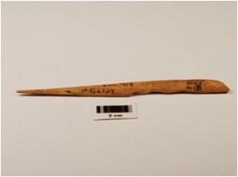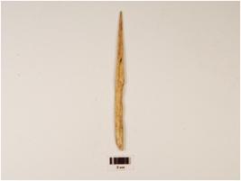 | Description / विवरण | Bone point with a elongated body, bone marrow hollow, pointed at one end, cut marks found on surface, slight fractures visible on sides, polished surface. |