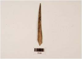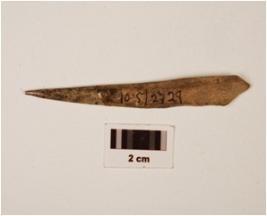 | Description / विवरण | Bone point with a tip broken broader end tapering to a point, bone marrow hollow visible on one side, polished surface. |