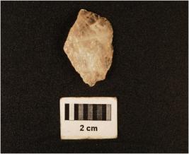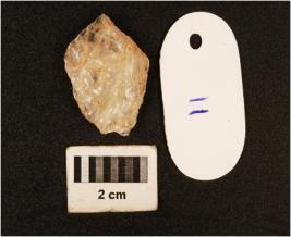 | Description / विवरण | A side scraper on end struck flake made on quartz with smooth surface and diffused bulb on ventral, use-wear marks on working edge and white in colour. |