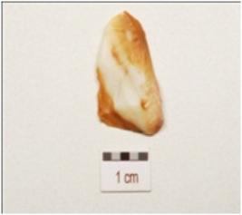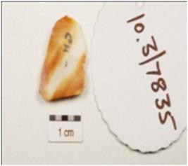 | Description / विवरण | A utilized flake made on chert, end struck flake, use ware marks on cutting edge, flake scars on one surface and plano convex in section. |