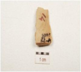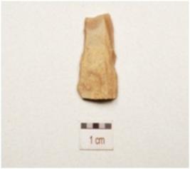 | Description / विवरण | Fragment of a chert backed blade with two ridges on dorsal side, partly broken from both ends, use wear marks along cutting edges and partly trapezoidal in section. |