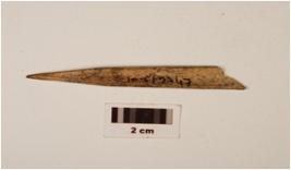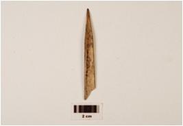 | Description / विवरण | A point with a pointed end a polished surface, hollow surface of bone marrow visible on one side, broken at other end, slightly bend. |