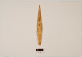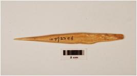 | Description / विवरण | Bone arrow head with a pointed end and other end broad with cut marks on surface, tanged, polished surface. |