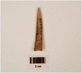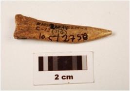 | Description / विवरण | Bone point with one end pointed, hollow of bone marrow on one side, porous on broader end polished surface. |