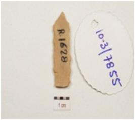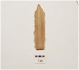 | Description / विवरण | A blade made on end struck chert, prepared platform ridges on the dorsal side and use wear marks along cutting edges. |