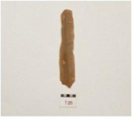 | Description / विवरण | A blade made on end struck chert, prepared platform on proximal end, use wear marks along the cutting edges and smooth surface. |