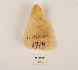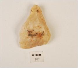 | Description / विवरण | A flake made on quartz, ridge on dorsal surface, irregular edges, difused bulb. |