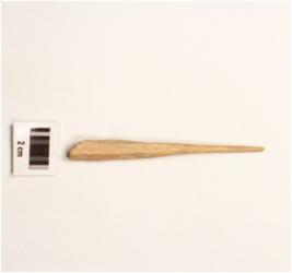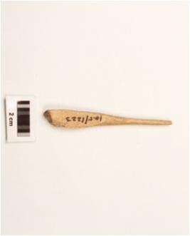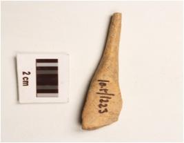 | Description / विवरण | A bone point fragment with smooth surface, slightly broken from pointed end with long narrow surface. |