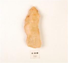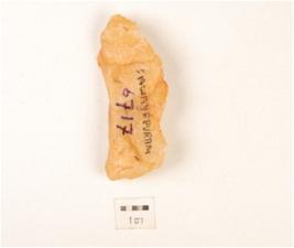 | Description / विवरण | A flake made on quartz, irregular edges, flake scars on surface. |