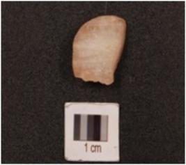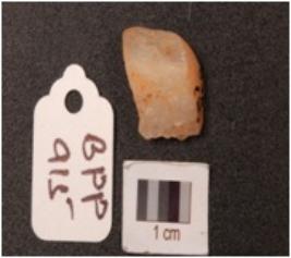| Description / विवरण | Fragment of a blade ridge on dorsal side, broken, along proximal end, intact distal end bearing cortex, use-wear marks along cutting edges. |