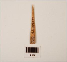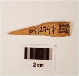 | Description / विवरण | Bone point with pointed at one end and broader at the other end, with a porous surface, polished near the pointed end, cut marks visible on surface. |