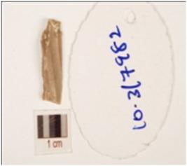 | Description / विवरण | A chert blade with a striking platform at proximal end, diffused bulb on ventral side and ridges on surface. |
