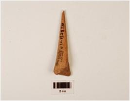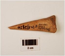 | Description / विवरण | Point with a broken tip, the broader end is porous bone marrow hollow visible on one side, polished surface. |