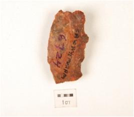 | Description / विवरण | A flake made on chert, ridge on dorsal surface, irregular edges, difused bulb. |