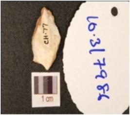 | Description / विवरण | A chert side scraper, end struck slight chippings on surface, use wear marks on working edge, striking platform with a diffused bulb on ventral side. |
