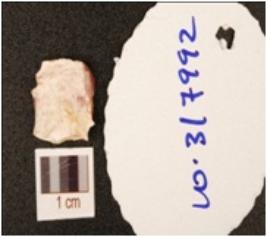 | Description / विवरण | A chert blade with a striking platform on one end, positive bulb on ventral side, weathered surface and triangular cross section. |
