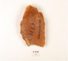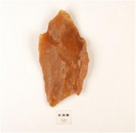 | Description / विवरण | A scraper made quartzite, flake scars on dorsal surface, irregular edges, prepared platform. |