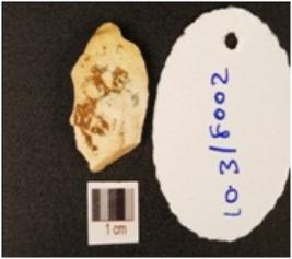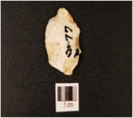 | Description / विवरण | A chert Utilized flake with a striking platform on proximal end with a positive bulb on its ventral side and retouches are visible on the working edges. |