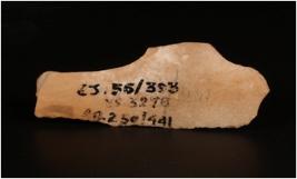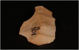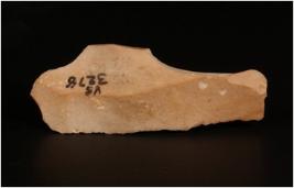 | Description / विवरण | Fragment of a chert blade with a mid-ridge on dorsal side, broken along the distal end diffused bulb on the ventral side and prepared platform. |