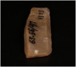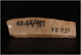 | Description / विवरण | A parallel sided blade made of chert, two ridges on dorsal side, broken at distal end and use-wear marks along the cutting edges. |