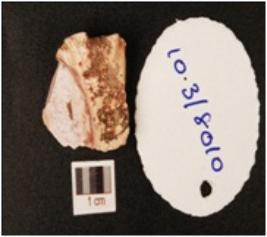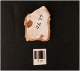 | Description / विवरण | Chert core with flake scars on surface, part of cortex visible, striking platform and triangular cross section. |